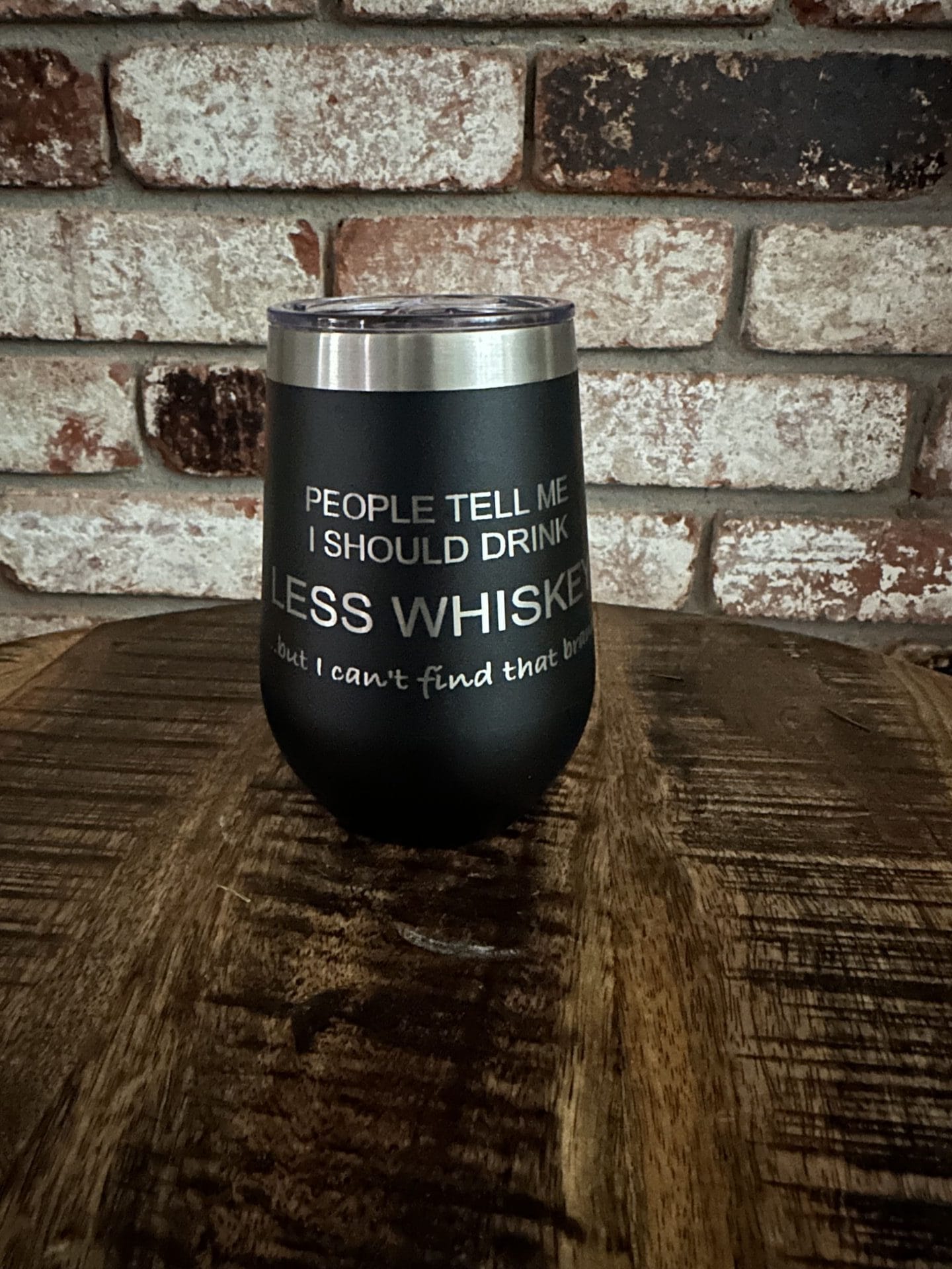 This tumbler has been engraved with PEOPLE TELL ME I SHOULD DRINK LESS WHISKEY... but I can't find that brand. It is the only one we have of this kind.