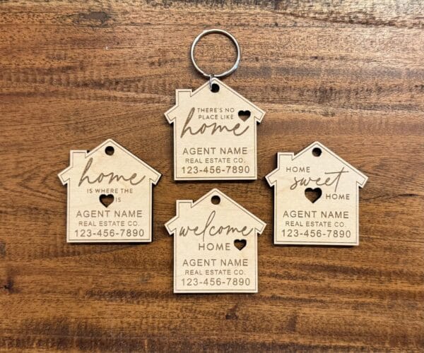 Laser cut from 1/4" birch plywood. These Custom Branded Realtor Key Chains can be customized and used as Realtor swag for open houses, or as a nice gift at closing. These key chains come in 4 styles and can be personalized with your name, number, website, logo, or any information YOU prefer. The Custom key chain is a great way to promote your business. Bulk pricing is available.