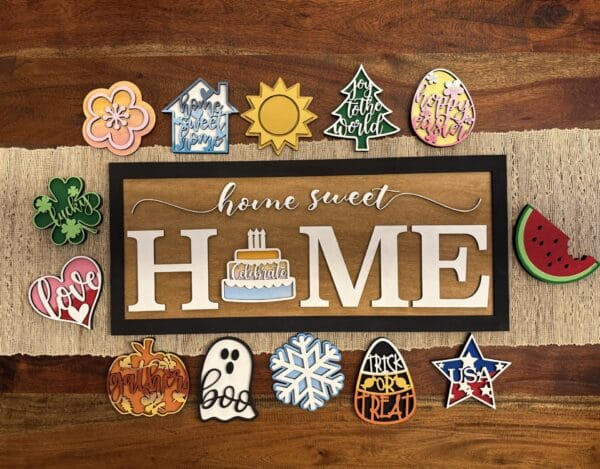Laser cut from 1/4" birch plywood. This sign comes unfinished and ready for you to paint, stain, and embellish, OR you can purchase it fully painted. There are other designs sold individually in the DIY section of my shop. With this purchase you will receive ONE Home Sweet Home sign and the interchangeable(s) you choose, plus a velcro dot for each. This sign comes ready to hang, or can be a shelf leaner.